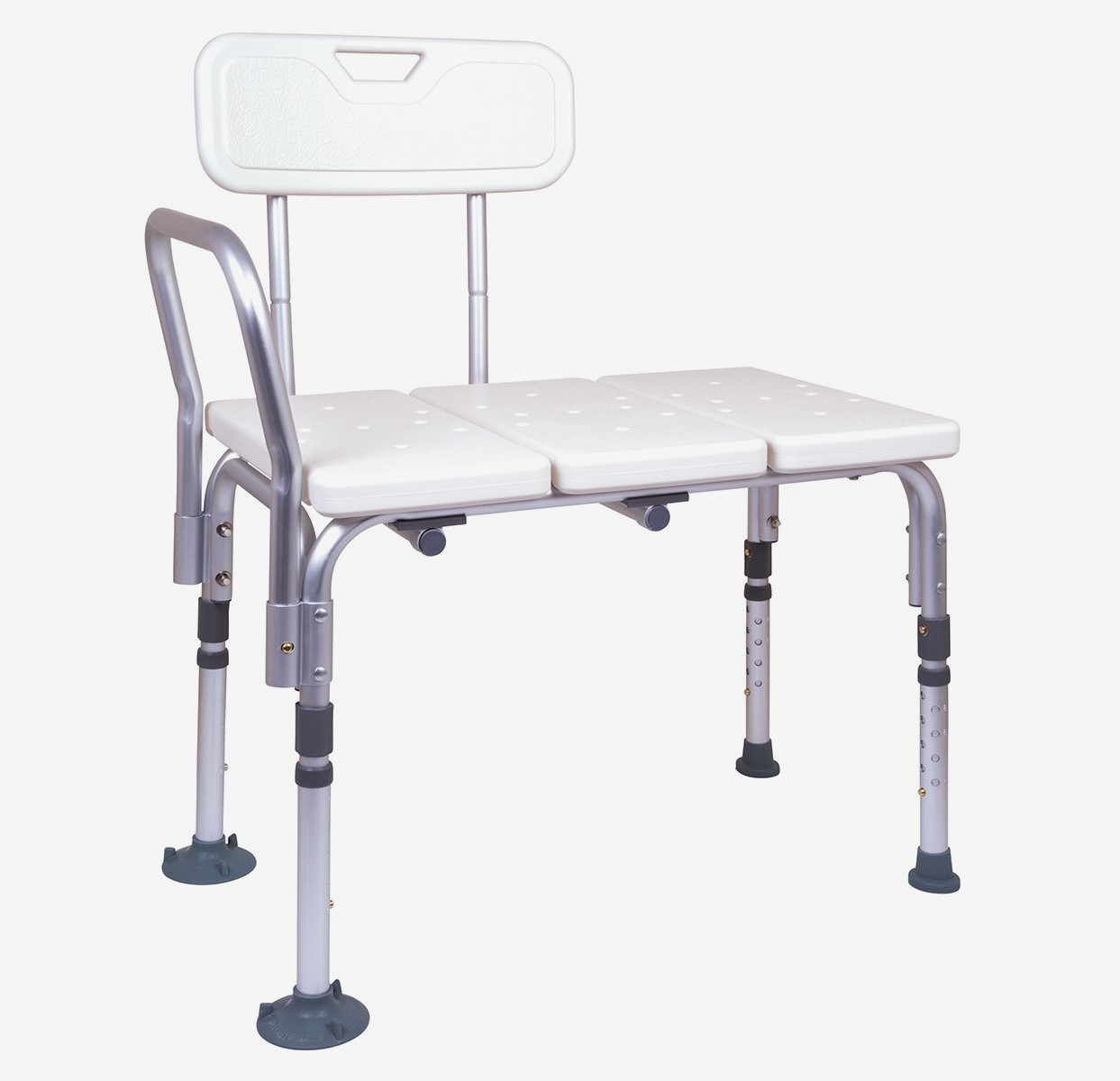 This Transfer Bench helps make transfers in and out of the bathtub safer and more comfortable. Constructed with an aluminum anodized frame and blow-molded bench, it features an adjustable seat back for right or left handed transfers. The angled legs have one-inch, easy-snap button adjustments and wide-based, non-skid feet for added sturdiness and safety. Tool-free assembly and limited lifetime warranty are standard.