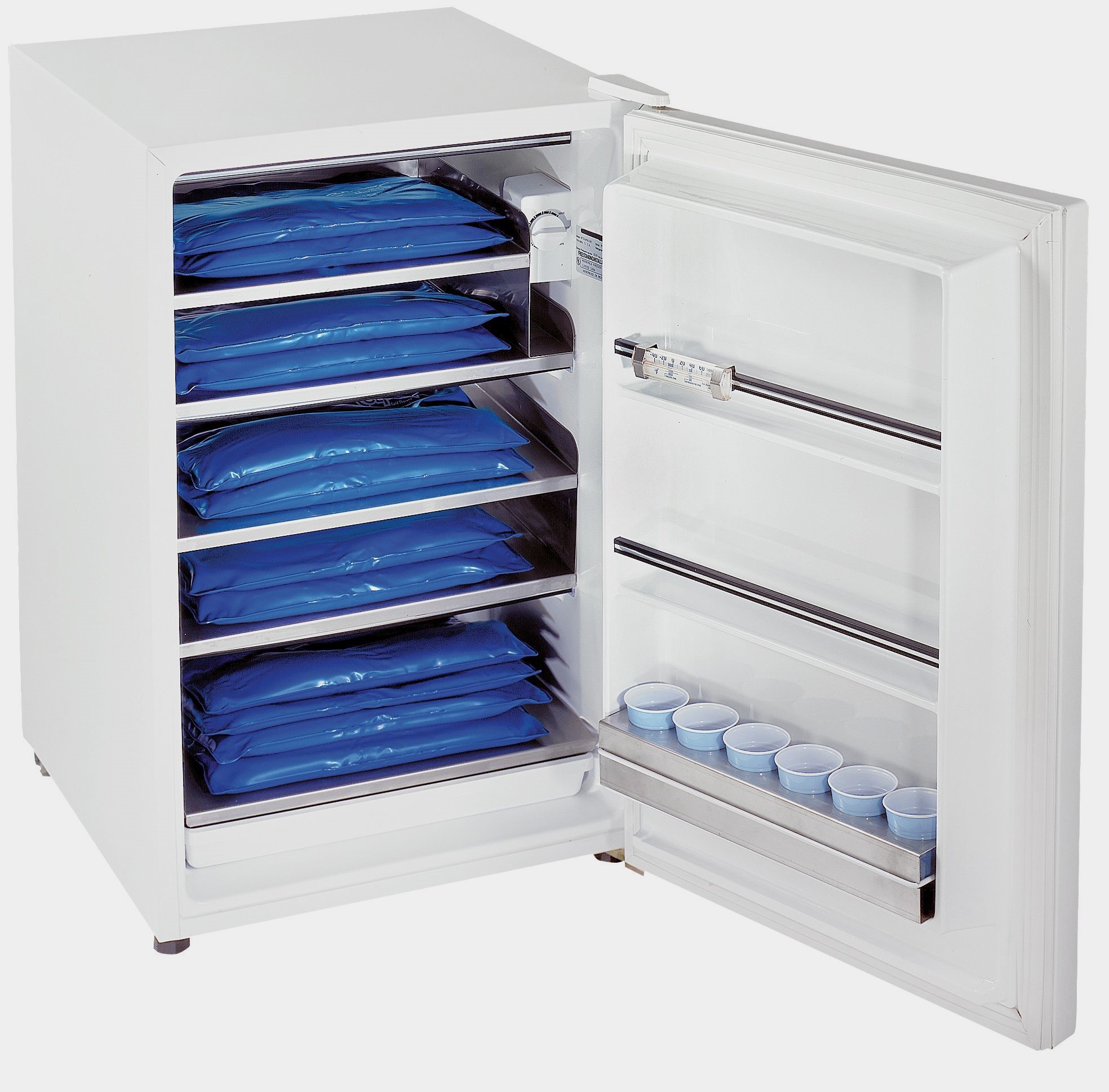 The ColPaC® Freezer comes with 12 standard ColPacs that can be recycled every 2 hours. It has 5 spacious cubic feet of capacity with 4 convenient quick freeze shelves with trays and cup holders. It also facilitates the use of cold therapy.